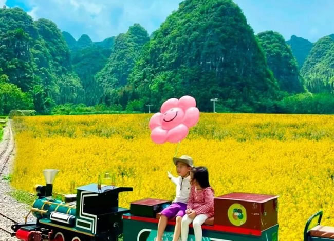 乘坐空調(diào)旅游觀光列車出發(fā),列車上來(lái)自興義的阿哥阿妹帶領(lǐng)大家感受濃濃 的布依族風(fēng)情,一起載歌載舞,感受春日的美好浪漫。