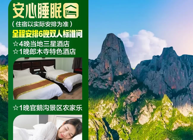 3、住宿:全程5晚商務(wù)型雙人標(biāo)準(zhǔn)間+1晚官鵝溝景區(qū)為農(nóng)家樂。(以實(shí)際安排為準(zhǔn))